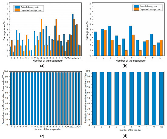 Figure 17. The damage condition assessment and the service life estimation of representative monitoring indexes: (a) the damage rate of suspenders during the design service life period; (b) the damage rate of tied-bars during the design service life period; (c) residual service life estimation of suspenders; (d) residual service life estimation of tied-bars.