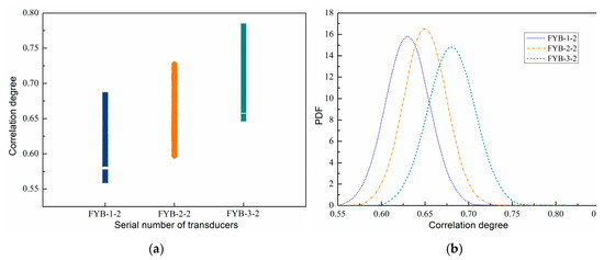 Figure 18. The correlation degree and corresponding probability distribution functions: (a) the correlation degree of the monitoring strain data; (b) the corresponding probability distribution functions of the correlation degree.