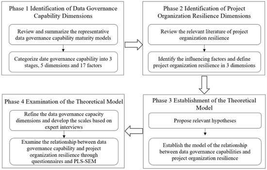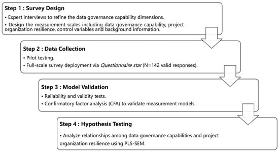 The remainder of this study was organized as follows. Firstly, we defined and conceptualized data governance capabilities, and developed an initial measurement scale by conducting a systematic literature review. Secondly, we constructed a cross-level theoretical model linking data governance capabilities and project organization resilience, proposing specific hypotheses to elucidate the relationships between the dimensions of data governance capabilities and their impact on project organization resilience. Then, we refined the initial dimensions and indicators through expert interviews and validated the measurement framework using pre-test data and factor analysis, ultimately deriving the final data governance capability scale for construction enterprises. Finally, the data were analyzed by the PLS-SEM method to examine the proposed hypotheses. The Discussion and Conclusion sections show how this research enriches the existing literature and provide theoretical and practical guidance. The research design process diagram is shown in Figure 1.