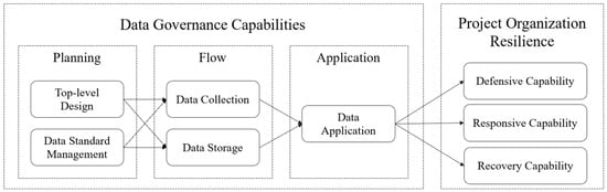 Project organization resilience is manifested as the system’s adaptive capability to respond to uncertain shocks, a mechanism that can be explained by the dynamic capabilities theory and the resource-based view. As the final stage of data governance, data application capability systematically strengthens project organization resilience across three capability dimensions—defensive, responsive, and recovery—by supporting risk identification, resource allocation, and dynamic adjustments through the deep analysis of governed, high-quality project data [].