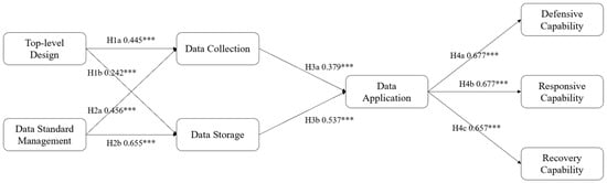 Regarding recovery capability, data application capability fosters recovery resilience through knowledge integration and innovation. Post-crisis, project organizations leverage data governance to integrate internal and external resources and, through exploratory and exploitative innovation, absorb new knowledge and seek development opportunities []. Data-driven decision systems optimize survival capability under resource constraints, for example, by recording crisis response experiences in knowledge repositories to provide a foundation for subsequent project recovery []. Such adaptive learning ensures continuous improvement in volatile environments [].