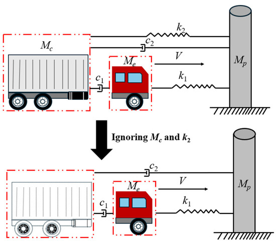 Previous research [46] showed that due to the low stiffness of the outer surface of the vehicle, the vehicle surface was squeezed and deformed quickly during the collision. However, the stiffness of the engine exposed during the collision is much greater, and its impact response to the bridge pier is more significant than that of other components. In this case, the engine can be approximated as a point load relative to the scale of the bridge pier. To balance computational efficiency with accuracy, this paper adopted a two-degrees-of-freedom (2-DOF) mass-spring model proposed in references [47,48] to simulate the collision process between the vehicle and the bridge pier. This 2-DOF model is a simplification of the three-DOF model, ignoring the mass of the cargo and the deformation stiffness between the cargo and the bridge pier. Figure 1 illustrates the simplification process, where Me, Mc, and Mp represent the equivalent mass of the engine, cargo, and bridge pier, respectively. The parameter c1 represents the damping between the engine and the vehicle due to deformation and compression, while c2 represents the damping between the vehicle and the bridge pier due to deformation and compression of the remaining vehicle components. k1 is the deformation stiffness between the engine and the bridge pier, and k2 is the deformation stiffness between the vehicle cargo and the bridge pier.