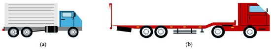 In this section, the vehicles in the mass-spring model are proposed to conduct the vehicle-with-pier collision analysis. Compared with small cars, trucks usually pose a greater threat to bridge piers due to their larger mass. Therefore, two typical types of heavy vehicles are considered herein for illustration, including the Ford F800 truck (hereinafter referred to as truck) and the semi-trailer tractor (hereinafter referred to as tractor), as shown in Figure 2. Table 1 provides the specific details of the two types of vehicles considered.
