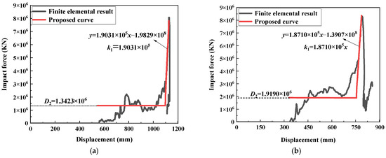 Xu [49] obtained k1 through finite element simulation of vehicles hitting bridge piers based on linear regression of an engine impact displacement diagram and assumed that the constant damping force generated by c2 was expressed as D2. Figure 3 shows the force–displacement relationships of the engines of the two vehicles.