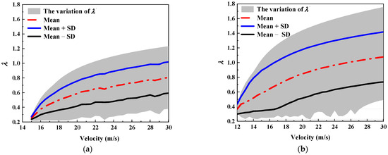To ensure the statistical reliability of the Monte Carlo simulation results, a convergence study was performed. The damage indicators stabilized when the sample size reached 1000. Therefore, 1000 samples were used in this study to balance the accuracy and computational efficiency. Using the Monte Carlo methodology shown in Section 2.3, a complete event set including 1000 samples was generated. A highway environment is considered herein, and the maximum truck velocity is set as 27.78 m/s in accordance with the Road Traffic Safety Law of the People’s Republic of China [57]. The truck’s velocity was varied between 10 m/s and 30 m/s with an increment of 0.5 m/s. Figure 5 shows the calculated pier’s damage under different impact velocities, where the pier’s damage locates in a range at a given truck velocity due to the influence of uncertainty. As Figure 5 shows, at a given level of vehicle velocity, the structural uncertainty could lead to significant variability in the pier’s response. For example, at a given velocity of 26 m/s, the difference between the maximum and minimum pier’s damages are 0.87 and 1.35 for the truck and tractor, respectively. Moreover, the variability inherent in the pier’s damage under collision increases with an increase in vehicle impact velocity. This is because the high velocity of a vehicle would lead to high nonlinearity for the pier and the structural nonlinearity could couple with the structural uncertainty. This coupling effect would further magnify the influence of structural uncertainties on the pier’s response under collision. Consequently, it is crucial to incorporate the effect of structural uncertainty in the pier’s response under collision, especially for cases under a high-velocity collision.