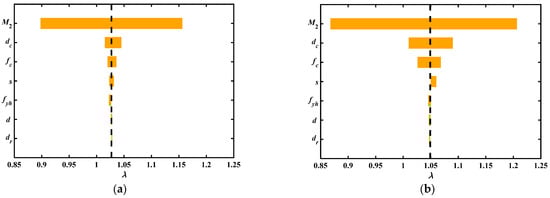 This section performed a sensitivity analysis to evaluate the importance of the considered uncertainty parameters and their influence on the piers’ response under collision. The impact of each random variable on the response was investigated by increasing or decreasing its standard deviation individually. The pier’s response under collision corresponding to the variability of each random variability was represented by the Tornado Diagram, as shown in Figure 6. As observed, the mass of the vehicle engine (M1 and M2) is the most sensitive variable. Even a small change in mass will lead to a large change in the final damage index, which dominates the uncertainty analysis. Among the random variables related to the pier, the section diameter (dc), concrete strength (fc), stirrup spacing (s) and stirrup yield strength (fyh) have a high to low influence on the vehicle impact with the RC pier. The longitudinal reinforcement diameter (dr) and stirrup diameter (d) are structural-related random variables, which showed minimal sensitivity in the analysis. In addition, dr and d have little effect on the vehicle impact with the RC pier.