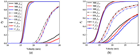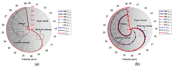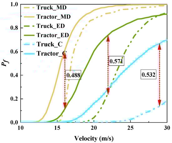 Figure 7 shows the vulnerability results for the considered truck and tractor. As observed, the failure probability of the pier tended to increase rapidly overall with the increase in vehicle velocity. Through a comparison between the vulnerability results for the truck and tractor, it is clear that, at a given level of vehicle velocity, the failure probability of the tractor is always larger than that of the truck, showing more significant damage potential. Specifically, for the vulnerability results at an MD limit state, the maximum difference between the failure probability of the tractor and truck could reach 0.488 at v = 16 m/s. As for the ED limit state, this maximum difference could reach 0.571 at v = 22 m/s. Under the collapse limit state, the maximum difference in fragility results between the truck and the tractor is 0.532. This indicates that a tractor can cause damage to bridge piers at lower velocities, whereas a truck requires a higher velocity range to cause damage. This is primarily due to the fact that, compared with a truck, a tractor is a heavier vehicle with a larger engine mass and higher spring stiffness (k1) between the tractor engine and the bridge pier. As a result, at the same velocity, the tractor tends to cause greater damage to the bridge pier upon impact.