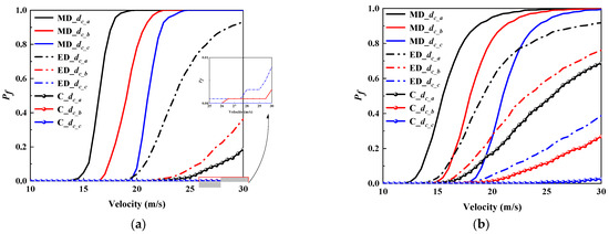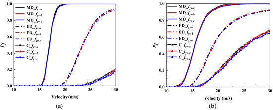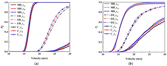 Figure 9 shows the vulnerability results considering varying levels of fyv. It is clear that the vulnerability curves for both the truck and the tractor vary slightly as the value of fyv increases. This result revealed that the yield strength plays a relatively unimportant role in failure probability. In addition, comparing Figure 8 and Figure 9, it is clear that the concrete strength shows a more significant effect than the stirrup yield strength on the collision vulnerability of RC piers. The primary reason is that the volume of concrete in the pier is significantly larger than that of the stirrups. As the primary load-bearing material, the compressive strength of concrete directly influences the pier’s load-bearing capacity and failure mode during a vehicle collision.