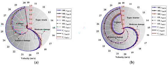 This section discusses the influence of vehicle-related parameters, which mainly include the vehicle impact velocity (v), impact height of the vehicle (Li1,2) and the distance from the engine to the front of the vehicle (xen1,2). As shown in Table 6, Li1 and Li2 are the impact heights of the truck and the tractor, respectively. xen,1 and xen,2 are the distances from the engine to the front of the truck and the tractor, respectively. The four parameters are considered to have three levels of variation: low, medium, and high, and are considered as deterministic parameters for vulnerability analysis.