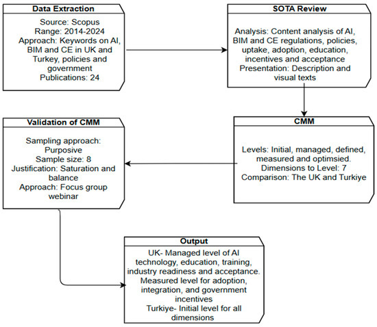 The data extraction process produced 54 relevant publications on the contexts of the UK and Turkiye. However, upon manual review, only 24 publications were relevant to add to the SOTA review. The SOTA review was applied by extracting existing knowledge on AI, BIM, and circular economy applications. Therefore, the SOTA review included AI, BIM and circular economy applications in the construction sectors of the UK and Turkiye. The data analysis following SOTA review used the qualitative content analysis approach in identifying significant texts associated with AI, BIM and CE in the UK and Turkiye. A qualitative approach to presenting the findings of the SOTA review was adopted to ensure readability of the output. The UK and Turkiye were selected for this study because of their diverse economic models in Europe, demographic contracts, geographical positioning and institutional diversity in terms of AI, BIM and CE. According to Ghisellini et al. [10] and Dellermann et al. [11], the UK has a Gross Domestic Product (GDP) of USD 3.1 trillion, while Turkiye has a GDP of USD 906 billion. Further, the UK is an EU and global financial hub, while Turkiye is close to Europe and the Middle East [10,11]. This provides a compelling and unique framework approach to the comparison. The findings, presented in tables and figures, led to the creating of a capability maturity model (CMM) for the UK and Turkiye, which was validated using expert opinions. A final CMM diagram was produced to recommend further research and policy applications. Eight experts in the construction industry were selected from the UK and Turkiye. The limitations in selecting more experts were due to the data extraction timeframe, availability and the application of purpose sampling in identifying key stakeholders in both countries. During the focus group webinar, saturation and consensus were reached regarding the responses. The respondents were selected for validation based on the purpose sampling approach and a benchmark of 15 years of experience in IT, construction leadership and academia (please refer to Section 5 for profile of the experts). An equal number of respondents were selected from the UK and Turkiye with the justification of saturation points. A focus group webinar was conducted separately for the UK and Turkiye to extract validation opinions from the respondents.