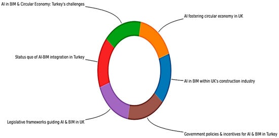 This SOTA review demonstrate the current state of AI in BIM within the UK and Turkiye’s construction industry with implications for the circular economy, government, policies, incentives, education, regulations and training requirements. As indicated in Figure 2 below, the qualitative findings present AI in BIM and CE in terms of Turkiye’s perspective, AI, fostering CE in the UK, status quo of AI–BIM integration in Turkiye, AI in BIM within the UK, legislative frameworks, and government policies on AI and BIM in Turkiye. These will be explained in the following sections.