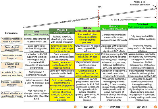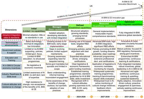 Based on the output of Figure 3 and Figure 4, the UK is currently in the managed phase, while Turkiye is in the initial phase of adopting AI in BIM and CE, respectively. Table 1 explains and compares the positions of both countries. The explanations of Figure 3 and Figure 4 are provided below.