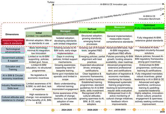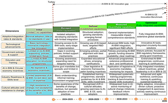Figure 5 illustrates the CMM for the UK with the green headings as the levels from initial to optimised. The dimensions are in the left brown colour and in yellow, the dimension of adoption and integration and standards was confirmed to be defined with established capabilities. Technological advancement has basic capabilities under the managed phase. Government policies and support in the UK, along with AI in BIM and CE incentives, are also defined. Education, training, industry readiness and cultural attitudes towards AI are colour coded yellow under managed CMM level. Figure 6 has the same arrangement as Figure 5, however, all the dimensions with the blue colour coding are at the initial phase. Hence, it was confirmed by the experts that Turkiye is at the initial phases of adoption, technology advancement in terms of AI, government policies, education and training, AI in BIM and CE incentives, industry readiness and skill level, cultural attitudes and resistance to change.