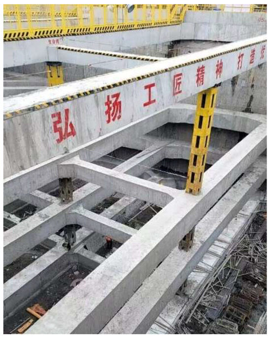 For deep foundation pit support in soft soil areas, the appropriate support system is usually selected based on factors such as geological conditions, the excavation depth, and the surrounding environment. Common systems include Deep Soil Mixing Columns, Diaphragm Walls, Contiguous Pile Walls, Soil Nailing Walls, and Internal Bracing Systems using Ground Anchors, Concrete Struts, or Steel Struts. As shown in Figure 1, the engineering cases studied in this research all involve diaphragm walls with internal support systems using concrete and steel braces. Deep foundation pit projects in Ningbo’s subway stations are typically located in densely built-up urban areas, where the strict control of settlement and lateral displacement is required. During construction, the combined internal support system with concrete and steel braces shares the load, which not only controls deformations caused by stress redistribution due to construction disturbances in the short term, but also ensures the long-term load-bearing capacity, effectively preventing the buckling of the support structures.