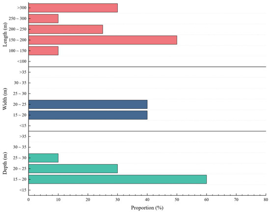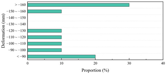 By summarizing and statistically analyzing the maximum excavation depths across all 10 foundation pit engineering cases examined in this study, the results presented in Figure 3 were obtained. As shown in Figure 3, the maximum vertical surface deformation caused by foundation pit excavation is downward settlement. The majority of maximum surface deformation values are distributed within the range of less than 130 mm, accounting for 30% of all intervals. Such low levels of settlement may be attributed to shallow excavation depths, high-strength support structures, or favorable geological conditions. Additionally, high settlement cases exceeding 150 mm are also observed. These higher settlements are typically associated with deeper excavations or more complex geological conditions, reflecting significant deformation in projects where support measures were inadequate or the geological conditions were unfavorable.