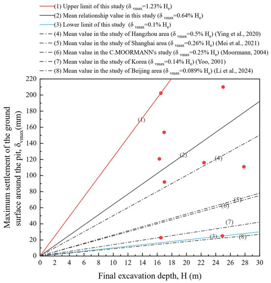 The relationship between maximum excavation depth and maximum surface settlement, with reference to studies by Li et al. (2024) [11], Ying et al. (2020) [31], Mei et al. (2021) [32], Moormann (2004) [33], and Yoo (2001) [34].