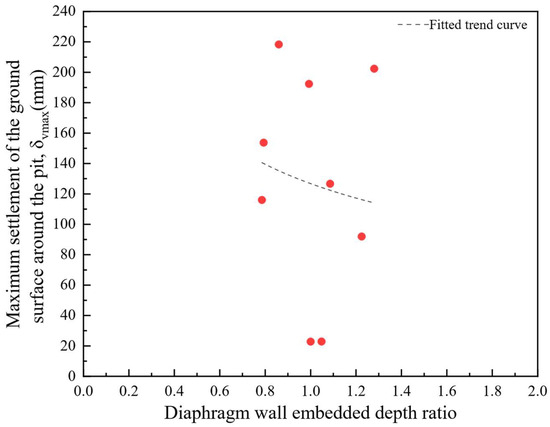 But, it is worth noting that the scatter points in the figure still exhibit significant dispersion and the relationship between the two factors remains quite weak. One possible reason is that site-specific geological conditions, soil properties, and variations in construction methods may overshadow the effect of increasing the embedded depth ratio. These other factors introduce considerable variability, making a direct correlation with the maximum surface settlement less pronounced. Consequently, the embedded depth ratio of the diaphragm wall alone has a limited impact on the maximum surface settlement.