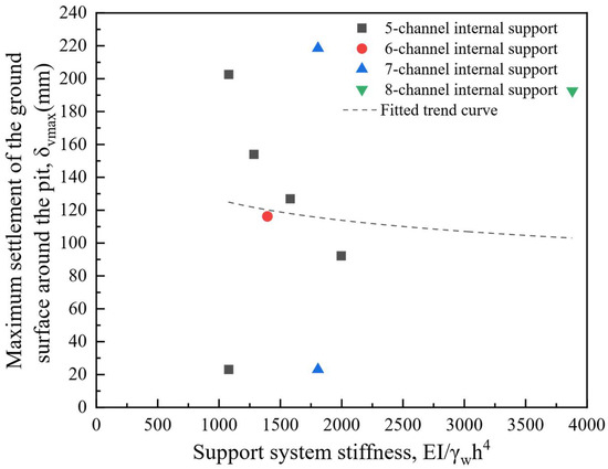 Although the overall trend in Figure 6 is clear, the dispersion of the scatter points should also be noted. Similar to the relationship between the diaphragm-wall-embedded depth ratio and surface settlement, the effect of support system stiffness on surface deformation is indirect. In actual engineering practice, relying solely on increasing support stiffness is not the only effective and economical method for controlling surface settlement. Instead, it should be combined with the characteristics of the foundation pit’s retaining system and other factors, with a comprehensive evaluation of design parameters to achieve a more economical and safe foundation pit support solution.
