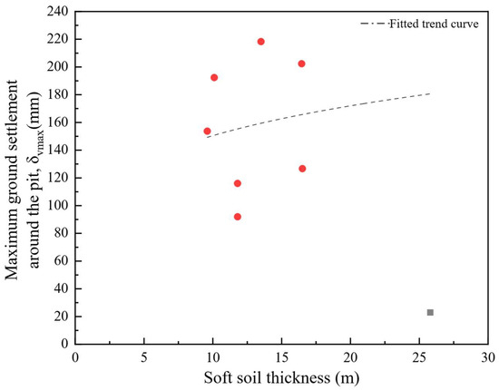 Figure 7 presents the relationship between the thickness of the soft soil layer and the maximum surface settlement around the excavated pit. The trend curve fitted to the data points shows a slight negative slope, indicating that, on average, as the thickness of the soft soil increases, the maximum surface settlement exhibits a small decreasing trend. However, the data points exhibit a broad distribution with significant dispersion, revealing a weak correlation. One possible reason for this weak correlation is that differences in the soil layer distribution, variations in groundwater levels, and the complexity of construction methods may overshadow the influence of the soft soil thickness itself. Additionally, the excavation depth, support system layout, and other engineering measures during construction may further mask any direct relationship.