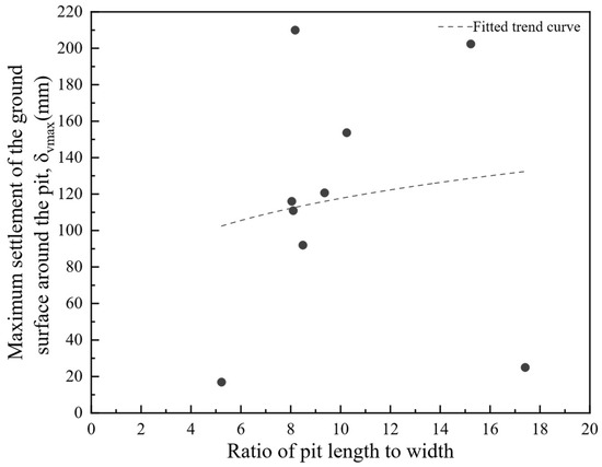 However, the data points are scattered and the slope of this trend is relatively small, indicating that while a positive relationship is present, it is not pronounced. And, contrary conclusions exist under different regional or soil conditions. Research based on a case study of collapsible loess in Xi’an [38] indicates that as the pit’s aspect ratio increases, the maximum ground surface settlement decreases. A possible explanation, akin to how the embedment ratio may influence the maximum ground settlement, is that project-specific factors—such as geological conditions, groundwater distribution, construction methods, and the support system design—can partially obscure the effect of the pit geometry. Consequently, the length-to-width shape of the foundation pit may not always directly translate into changes in the maximum ground surface settlement. Furthermore, the discrepancies between this and other studies suggest that, across all scenarios, the pit’s length-to-width ratio does not consistently or robustly exhibit a uniform correlation with settlement. The comprehensive consideration of geological conditions, support system characteristics, and construction processes remains essential. In addition, the coupled influence of the length-to-width ratio and other factors still warrants further investigation.