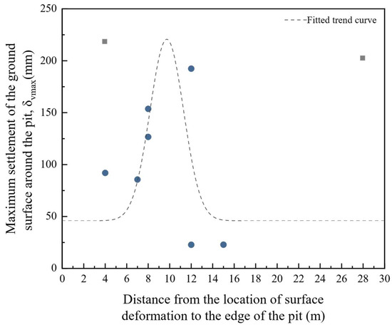 Surface deformation is typically most pronounced at a certain distance from the excavation edge. Studies have shown that deformation amplitudes decrease significantly with an increasing distance from the edge [45]. Figure 9 illustrates the relationship between the maximum ground surface settlement and the distance from the surface deformation location to the pit edge in the cases analyzed in this study.