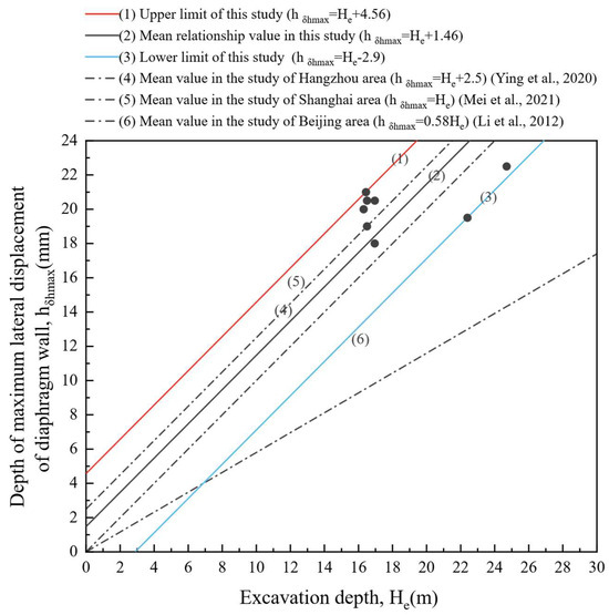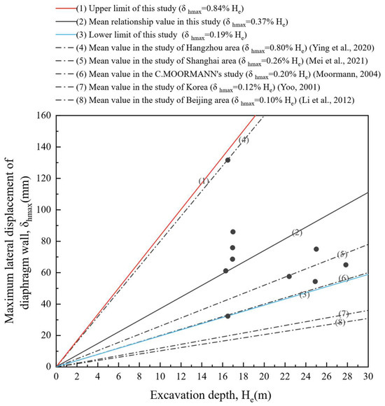 Relationship between the maximum lateral deformation value of pit enclosure structure and final excavation depth, with reference to studies by Ying et al. (2020) [31], Mei et al. (2021) [32], Moormann (2004) [33], Yoo (2001) [34], and (Li et al., 2012) [46].