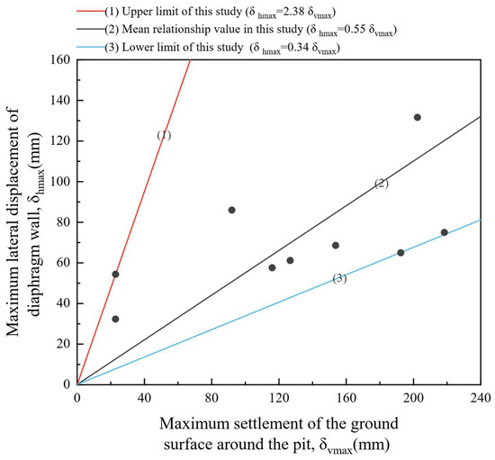 In Figure 12, the red, black, and blue lines represent the upper limit (), mean value (), and lower limit () relationships defined in this study, respectively. The observed relationships indicate that under adverse geological conditions or extreme scenarios, larger settlement around the excavation area poses significant challenges to the stability of the diaphragm walls.