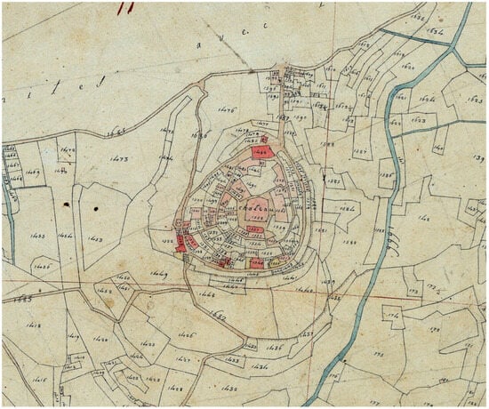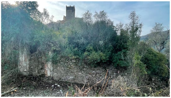 Borgo Castello is a settlement of significant landscape, historical, and architectural interest [,,,]. With prehistoric origins, the village is situated on a hill near the coast, aligned with the ancient Roman road system, of which some archeological remains can still be found. It played a crucial role in controlling the territory during the early Middle Ages. Initially feudal to the Marquises of Clavesana, the settlement later came under various dominions. The peak of its demographic occurred during the 16th and 17th centuries; however, it experienced a decline that was noted as early as the early 19th century in the Napoleonic Cadastre (Figure 3). At the top of the hill stands the tower of the medieval urban walls, which still provides access to the village. Nearby, you can find the Romanesque church of Saints James and Philip, which has been extensively restored by Alfredo D’Andrade, as well as the remains of the marquis’s castle and several buildings in ruin, partly covered by vegetation.