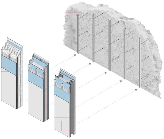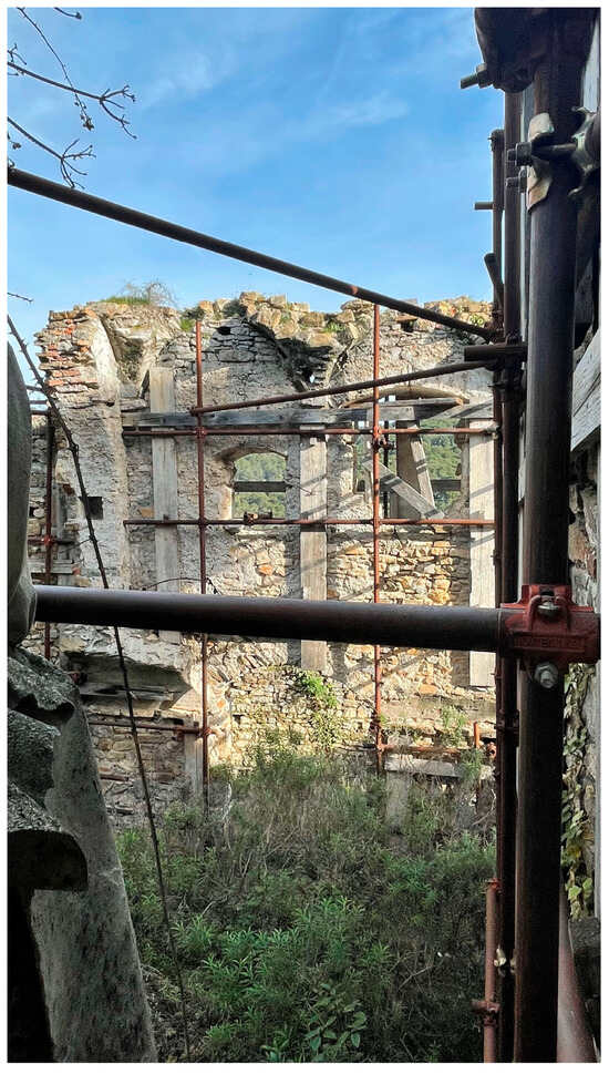 Additionally, a structural analysis of the ruins has been essential to assess their resistance, stability, and the need for consolidation, especially considering potential reconstruction efforts and the seismic risks in the area. The main issue is to address the structural stability of buildings coherently. This includes considerations for reinforcement to prevent damage that leads to structural instability, repairs for existing damage, and improvements for seismic resilience. Strengthening, repairing, and completing missing components are essential preconditions for seismic enhancement. Any structural intervention should rely on a comprehensive understanding of the building. This entails studying the building’s characteristic features and construction techniques and understanding the phases of extension, alteration, and both present and past layouts. When choosing intervention methods, it is possible to combine solutions and materials that are already part of the building with contemporary materials and techniques. It is also feasible to use traditional materials within new resistance schemes or innovative materials within traditional resistance schemes [] (Figure 10).
