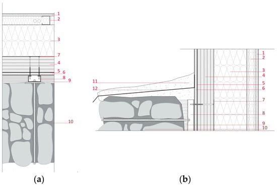 Constructive details in plan (a) and section (b) of the Cross Laminated Timber panels in connection with pre-existing stone wall. 1. Internal finishing; 2. galvanized steel profile; 3. insulation; 4. CLT; 5. transpiring layer; 6. pre-finished moisture-resistant hardboard; 7. pre-drilled stainless steel tape; 8. vertical stainless steel upright; 9. heat-insulating filling foam; 10. existing stone wall; 11. mortar reinforced with mesh; 12. lead or zinc flashing. By A. Acquisgrana and F. Brunengo.