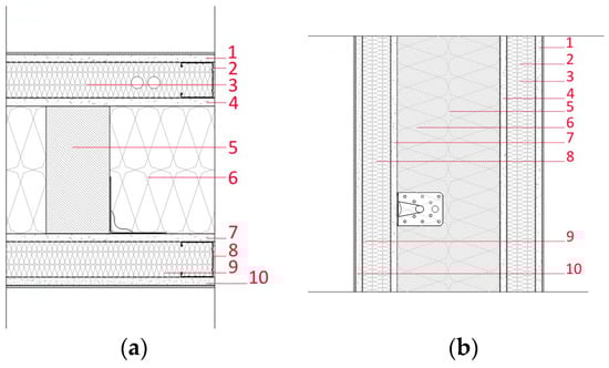 Constructive details in plan (a) and section (b) of the timber framed structure covered by light insulated panels. 1. Internal finishing; 2. galvanized steel profile; 3. insulation; 4. rigid panel; 5. glulam pillar; 6. insulation; 7. rigid panel; 8. galvanized steel profile; 9. insulation; 10. pre-finished moisture-resistant hardboard. By A. Acquisgrana and F. Brunengo.