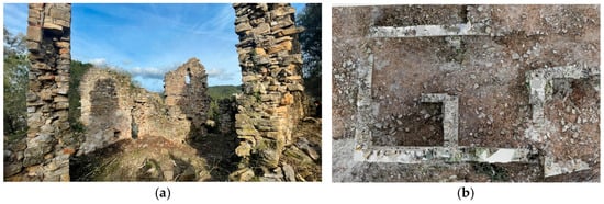 This site is, therefore, multi-layered and has been the subject of some historical studies and limited archeological excavations in the past [,]. However, it has lacked comprehensive and detailed surveys, along with targeted studies on the architectural remains, as well as the natural and landscape context. Additionally, the site is protected at various levels under the Cultural Heritage and Landscape Code (Figure 4, Figure 5 and Figure 6).