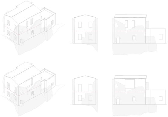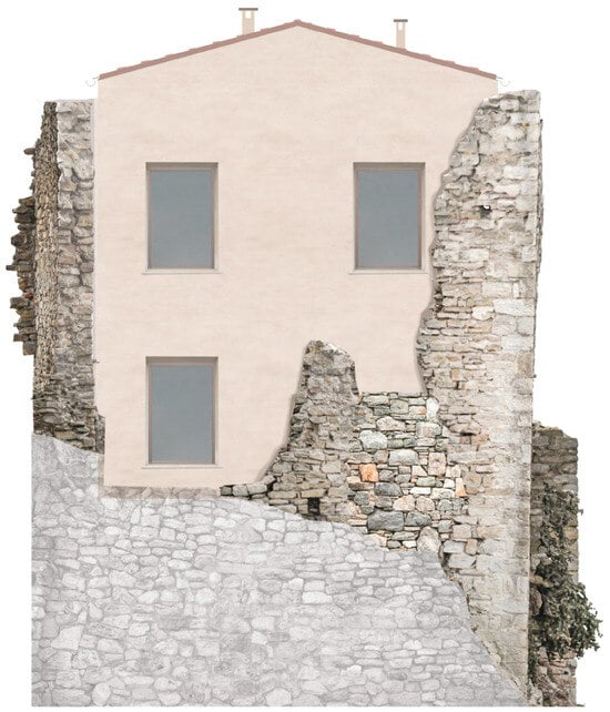 The reconstruction pre-design exploration, conducted in an intended schematic way, is intended to highlight, in advance, possible methodological and technical problems to be resolved in the detailed design. The exploration is the result of previous reflections and investigations. The definition of the new volume to be built, within the appropriately stitched and consolidated wall box (without, however, resorting to significant reconstructions) naturally derives from the results of the stratigraphy observation, which—where possible—have highlighted the presence of internal horizons and their constructive features (with stone vaults or wooden floors), the internal stair structures, the system of openings, and the morphology of the roofs (Figure 20).