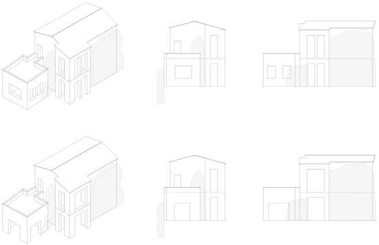 Particular attention must be paid to the definition of the system of openings of the new interior volume in relation to the surviving openings, the functional requirements, and the architectural style of the village. Various design explorations made explicit graphically (Figure 21) give an account of the multiple possibilities of architectural configuration, either strictly in line with the traditional construction lexicon or linked to a contemporary one, yet attentive and sensitive to the remaining structures. Renewed needs for comfort, then, require the insertion of new technical devices such as shading systems, not present in the historical building, which can be solved in innovative ways, preserving the constructive characteristics of the medieval village.