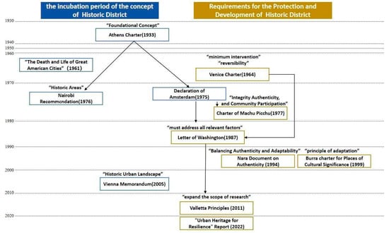 Historic districts have evolved significantly over the past century, influenced by seminal documents and international charters. The conceptualization of historic districts has undergone profound shifts since the early 20th century []. The first period was from 1900 to 1930. It emerged as a reaction to modernist urbanism, and foundational texts like the Athens Charter (1933) advocated for heritage protection beyond individual monuments []. After WWII, critiques of modernist planning (e.g., Jane Jacobs’ The Death and Life of Great American Cities) catalyzed interdisciplinary approaches to urban conservation []. This period saw a shift from focusing solely on individual monuments to recognizing the value of entire historic urban cores. Subsequent milestones, including the Venice Charter (1964) [], the Amsterdam Declaration (1975) [], the Nairobi Recommendation (1976) [], and the Washington Charter (1987) [], further expanded the scope and principles of conservation. In the late 20th century, the international framework expanded conservation principles. These included authenticity (Nara Document, 1994) [] and adaptive reuse (Burra Charter, 1999) []. In the 21st Century, the HUL framework (UNESCO, 2011) redefined historic areas as layered socio-ecological systems [], while recent ICOMOS initiatives (2022) integrate resilience into conservation agendas [] (Figure 1).