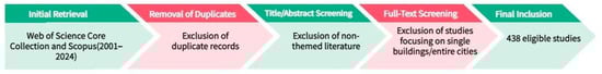 Given that our research focuses on the research trends of the 21st century, the time range was set from 2001 to 2024, and the search was conducted on 7 March 2025. To ensure the accuracy and completeness of the study, we excluded articles that focused on individual buildings, complete historic cities, standalone historic gardens, or forests, as these were not relevant to our research objectives. As a result, 438 articles were selected for analysis (Figure 2). The data used in this study does not include early research because there are significant differences in theory and methods between early and modern research. Early research has fewer documents and less mature research methods, which may interfere with the analysis of current research hotspots and emerging fields. The time range of 2001–2024 was chosen because significant changes have occurred in the field of historic district conservation since the 21st century. The research focus has shifted to areas such as sustainable development. During this period, the quantity and quality of research in the database are more guaranteed, and there have been many technological innovations in related fields. This is conducive to studying the impact of new technologies on historic district conservation.