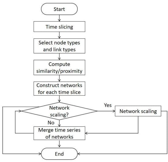 CiteSpace’s network scaling technique trims redundant links while preserving critical connections, ensuring clarity in visualizing disciplinary frontiers. To enhance cluster interpretability, noun phrases from document titles were extracted using the log-likelihood ratio (LLR) algorithm, enabling precise labeling of research themes []. Parameters such as node frequency and betweenness centrality reflect the scholarly impact of publications, while clustering outcomes delineate the conceptual framework of historic district research, offering a foundation for future inquiries []. Network Construction and Analysis encompasses several key steps: first, building citation or co-citation networks by selecting node types (such as authors, institutions, keywords) and link types to map the associative structure of the research field; next, applying centrality analysis using betweenness centrality to gauge nodes’ bridging roles in network connectivity (where higher values signify greater impact on connectivity) and eigenvector centrality to evaluate a node’s influence via its connections to high-impact nodes; and finally, performing cluster analysis with the LLR (log-likelihood ratio) algorithm []. This algorithm statistically identifies significant term co-occurrences to extract cluster labels, uncovering the field’s knowledge structure and research dynamics by clustering studies under shared themes. The process is illustrated in Figure 3.