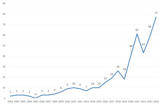 The number of publications is a significant indicator of the research development trend in the field of historic districts. The annual distribution and cumulative number of articles are shown in Figure 4. The overall trend indicates exponential growth, with a notable increase after 2013. The most significant surge occurred in 2021, likely driven by public health issues in historic urban areas during the COVID-19 pandemic []. Since 2015, the number of publications has shown substantial and rapid growth, with an average annual increase of 36.57%. This suggests that, although the concept of this field has been around for decades and there has been a long period of inactivity in terms of academic paper publications, it was not until the second decade of the 21st century that this field received extensive attention in academic circles.