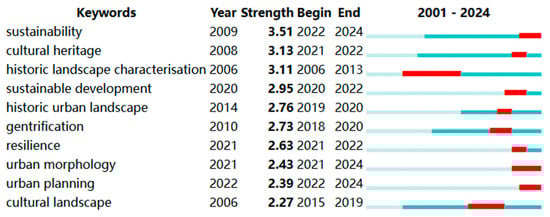 The rapid growth of research during this period may be attributed to multiple factors. For instance, after China implemented the “Regulations on the Protection of Famous Historical and Cultural Cities, Towns, and Villages” in 2008, there was a surge in research output (165 articles, accounting for 37.67%) []. Concurrently, following the release of UNESCO’s “Historic Urban Landscape (HUL)” framework in 2011, related studies grew starting from 2014. A citation burst for the keyword “historic urban landscape” occurred between 2019 and 2020 (burst strength: 2.76), indicating the guiding role of international policies in shaping research directions []. The peak publication volume in 2021 (77 articles) was directly related to the increased focus on the resilience of historic urban areas during the COVID-19 pandemic, with “resilience” emerging as a key keyword that year (burst strength: 2.63). For example, researchers noted that the layout of historic districts aids in pandemic isolation and enhances urban resilience []. Additionally, research on “heritage tourism” has grown since 2015 (keyword frequency: 23), aligning with the global demand for exploring the economic value of cultural heritage.