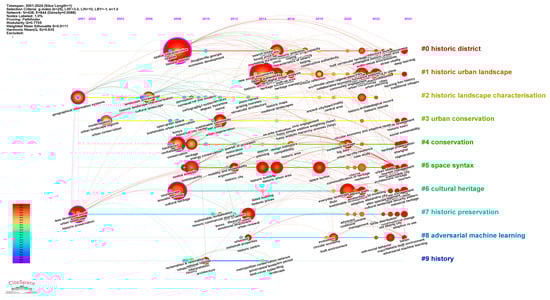 In the burst detection analysis using CiteSpace, the γ parameter is a crucial factor that significantly affects the sensitivity of identifying emerging trends. In this study, we set the γ parameter to 0.2, which was based on comprehensive considerations. Prior to setting this parameter, we conducted multiple tests with different γ values. When the γ value was set too low (e.g., 0.1), it generated an excessive number of detection results that included many minor fluctuations. These fluctuations might not represent truly meaningful changes in research trends and instead could interfere with the judgment of core trends. On the other hand, when the γ value was set too high (e.g., 0.5), some trends that changed moderately but were of great significance might be excluded from the analysis. In the field of historic district research, we aim to capture trends that are both significant and can reflect the real dynamic changes in the field. Through repeated tests and careful analysis of the results, we found that when the γ value is 0.2, it can retain key trend information while effectively filtering out unnecessary noise data. This setting allows the burst detection results to focus on the key factors that have a major impact during the development of the research and drive the transformation of research directions, which is consistent with the goal of this study to sort out the development context, hotspots, and trends in the field of historic district research. The results are presented in Figure 8. In order to study the development and changes of keywords, we have generated a keyword timeline chart. Using the Pathfinder pruning method, the analysis yielded a Modularity Q of 0.7705 and a silhouette S of 0.9111, as shown in Figure 9.
