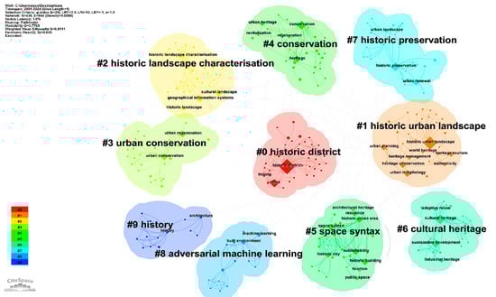 We conducted co-citation clustering analysis to identify the main research topics. By setting the node type to co-cited documents and using a 10% threshold, we obtained 438 nodes and 844 links. The analysis identified 10 effective clusters, as shown in Figure 10. The clusters cover a wide range of topics, including urban studies, environmental sciences, heritage conservation, and sustainable development. Cluster labels were extracted via the log-likelihood ratio (LLR) algorithm, and the validity of the 10 generated clusters was verified using Modularity Q and silhouette scores. We conducted comparative tests on the Mutual Information, Latent Semantic Indexing (LSI), and log-likelihood ratio (LLR) algorithms. Mutual Information clusters items based on statistical associations. In this study, it led to incoherent clustering concepts, making it difficult to reflect the uniqueness of historic district research. LSI had difficulty capturing the subtle relationships in the literature. It often merged different research fields, obscuring the research focus. In contrast, LLR can accurately identify term co-occurrences, effectively distinguish different research themes in historic district research, and better meets the research requirements. Using the Pathfinder pruning method, a Modularity Q value of 0.7705 was obtained, demonstrating significant modularity, as well as a Silhouette Score of 0.9111, indicating high internal consistency. These metrics confirm the robustness of the thematic groupings [].