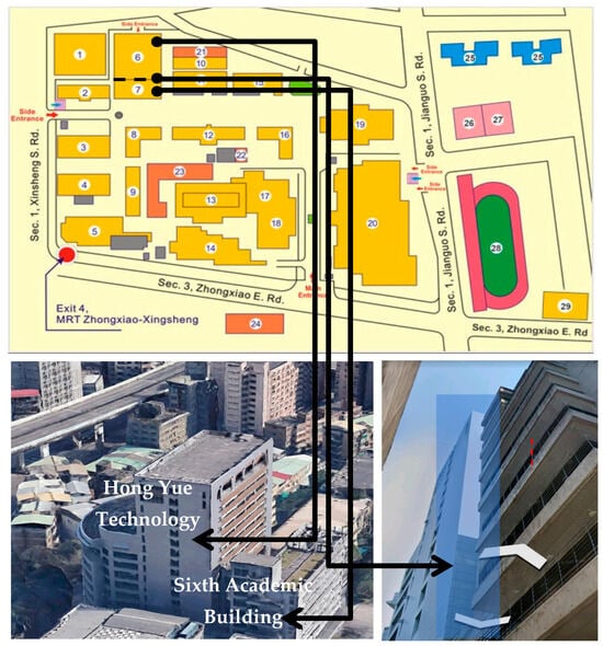 Location of the Sixth Academic Building (number 7) and Hong Yu Building (number 6) at National Taipei University of Technology (source: Google Earth, 2025) [38,39].