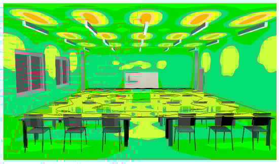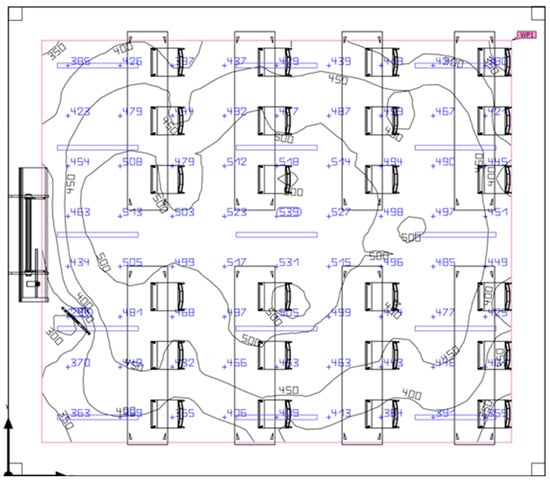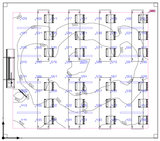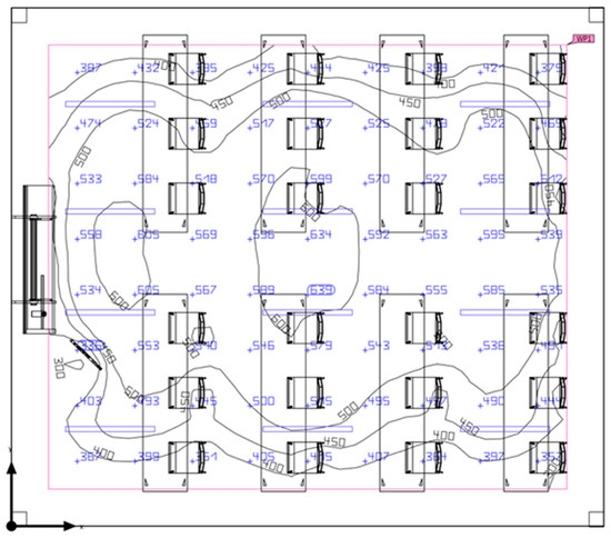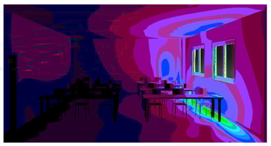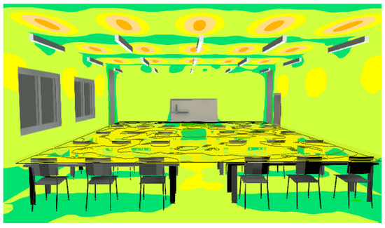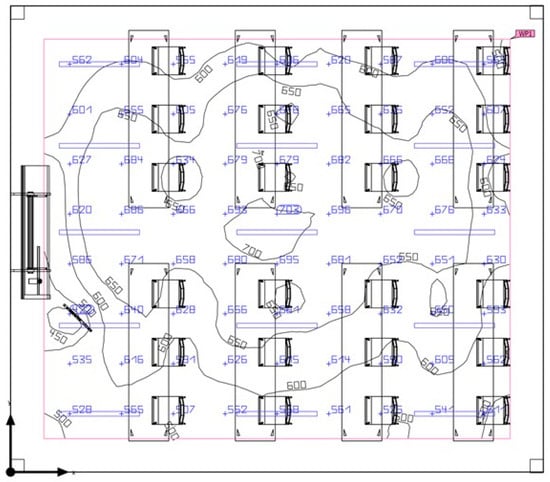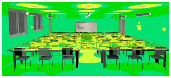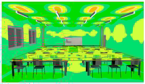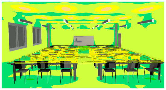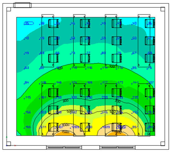The selected classroom has dimensions of 8 m × 7 m (56 m2) with ceiling heights of 2.5 m and 3 m, chosen because these reflect typical urban university classroom sizes in Taiwan, aligning with NTUT architectural standards and common educational building layouts [38]. These dimensions accommodate 24 students, consistent with average class sizes in higher education, and the height range (2.5–3 m) represents standard ceiling heights in modern and renovated school buildings, allowing us to test height’s impact on lighting design [21]. Classrooms in this building face serious limitations in utilizing natural light, even during daylight hours and peak usage times, due to its proximity to the tall Hong-Yue Technology Research Building, which is directly in front of its windows. To address daylight potential and its limitations an initial daylight assessment was conducted for this classroom using Dialux. Simulations evaluated daylight availability at noon (12 p.m.) under two conditions: with obstruction (adjacent Hong-Yue building) and without. Per EN 12464-1 standards [37], a classroom for adult education requires 500 lux. Without obstruction, daylight provided an average of 239 lux ranging from 31.4 to 1853 lux as shown in Figure 2, where the color scale represents illuminance levels (in lux), with blue indicating lower values and orange indicating higher values, falling short of the standard due to Taiwan’s predominantly cloudy and rainy climate, where overcast conditions prevail approximately 60% of the year [5]. This variability, combined with the site’s latitude (25° N), limits daylight reliability, though it reduces artificial lamp demand during daytime compared to obstructed conditions. With obstruction, daylight contribution dropped to an average of 1.66 lux ranging from 0.19 to 0.66 lux, as shown in Figure 3, where the color scale represents illuminance levels (in lux), with dark blue indicating lower values (around 0.19 lux) and lighter shades indicating higher values, a reduction of over 99% in illuminance. This near-total loss renders the classroom dark during the day, necessitating full reliance on artificial lighting, Figure 4 and Figure 5 show light distribution renderings in both positions. These findings reflect a broader urban challenge in Taiwan, where narrow streets, dense building layouts, and close proximities—often less than 5 m apart—obstruct daylight in many structures, as observed in Taipei’s compact urban fabric [40]. Consequently, this study prioritizes artificial lighting strategies to ensure visual comfort and energy efficiency, addressing real-world constraints in such urban educational environments.