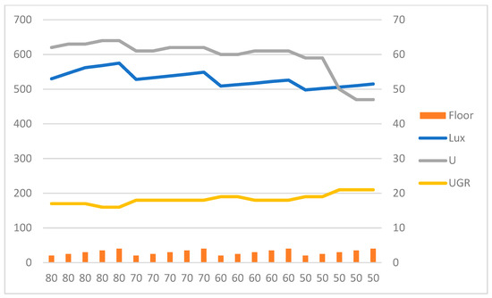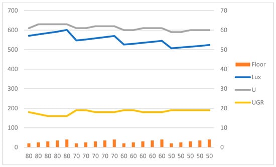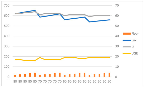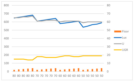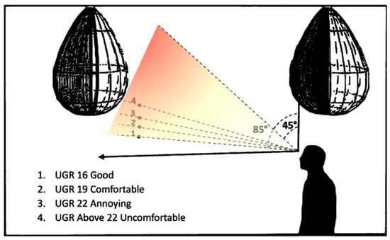 The UGR lower 16 is considered good, and up to 19 is acceptable, although it indicates higher glare levels. However, 19 is the threshold; values above this lead to increasing discomfort due to glare, reaching the “annoying” and “uncomfortable” levels, thus becoming unacceptable for suitable design. While 10 to 16 is good and up to 19 is acceptable, lower UGR values are preferable, indicating less glare. Therefore, various standards, such as CIE 117 [41], provide specific definitions for different UGR values [20], as presented in Table 2.