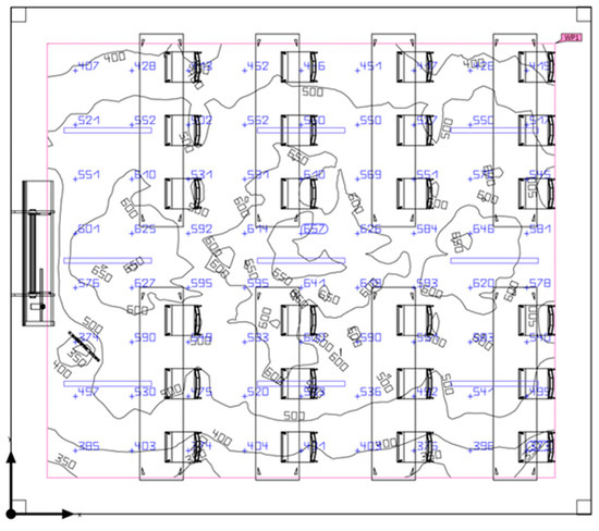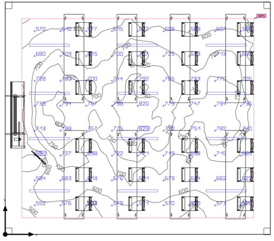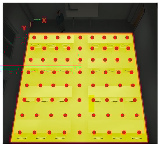 As stated earlier, this study simulated a real classroom at the National Taipei University of Technology in Taipei. The room’s dimensions are detailed in Figure 7. A rectangular room with dimensions of 8 by 7 m has an area of 56 square meters. It can accommodate 24 students, and the room is designated for adult education at the university, with classes held in the afternoons as well. The height of the room varied across two scenarios: one scenario with a height of 2.5 m and another scenario with a height of 3 m. The calculations focused solely on artificial lighting conditions, excluding natural light.