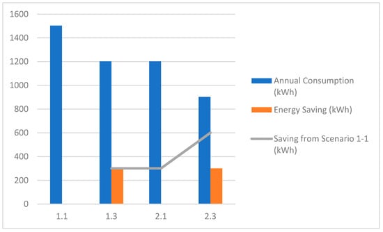 As shown in Table 6, energy savings of 300.67 kWh/year were achieved from scenario 1-1 to 1-3 and from 2-1 to 2-3 in each scenario. From 1-1 to 2-3 (combining increased surface reflectance and reduced height), energy savings reached 601.34 kWh/year. Based on the values obtained, Table 17 shows the reduction in carbon emissions.