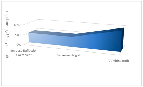 The results indicate that increasing reflectance alone (scenario 1-1 to 1-3) or reducing height alone (scenario 2-1 to 2-3) each leads to a reduction of 150.34 kg CO2 per year. The combination of reducing height and increasing reflectance (from scenario 1-1 to 2-3) results in a reduction of 300.67 kg CO2 per year, demonstrating a two-fold impact on carbon emission reduction.