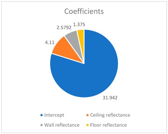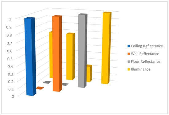 - Impact of Surface Reflectance: The model’s good predictive power was indicated by the regression analysis’s R square of 0.969662. It was found that light intensity increases by 4.11 units for every unit increase in ceiling reflectance and by 2.5792 units for every unit increase in wall reflectance. Furthermore, light intensity rises by 1.375 units for every unit increase in floor reflectance. Light uniformity and glare were greatly enhanced by raising the reflectance coefficients of the floor, walls, and ceiling. the largest influence was caused by the ceiling reflectance (50.9%), which was followed by the walls (32.0%) and the floor (17.0%). It was discovered that the best surfaces for improving light distribution and lowering glare were those with high reflectivity (ceiling ≥ 85%, walls ≥ 80%, and floor ≥ 40%). Furthermore, the correlation analysis indicated that wall and ceiling reflectance coefficients do not correlate with one another, but they do have the strongest correlation with light intensity. This discovery gives designers greater creative freedom. Furthermore, in each case (from scenario 1-1 to 1-3 and from scenario 2-1 to 2-3), merely increasing the reflectivity of surfaces resulted in a 20% decrease in energy usage. These findings demonstrate important role of surface reflectance for both visual comfort and energy efficiency.