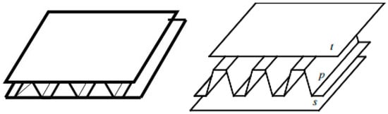 In corrugated sandwich plates, the corrugated core is an important part of the structure used to connect the upper and lower table plates, and the corrugated core is generally in sinusoidal or trapezoidal form (Figure 2). Figure 1 denotes the upper plate by t, the corrugated core by p, and the lower plate by s. In analyzing this sandwich structure, it is necessary to establish its computational model.