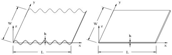 Considering the periodicity of the corrugated plate and the fact that it exhibits different elastic properties in the two directions, the corrugated plate can be modeled by comparing it to a homogeneous orthotropic various anisotropic plate. Assuming Young’s modulus as E and Poisson’s ratio as μ, as shown in Figure 3, the elastic constants of the orthotropic plates in the two directions are , , , , and . Here, and . , can be solved experimentally and analytically.